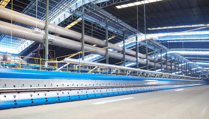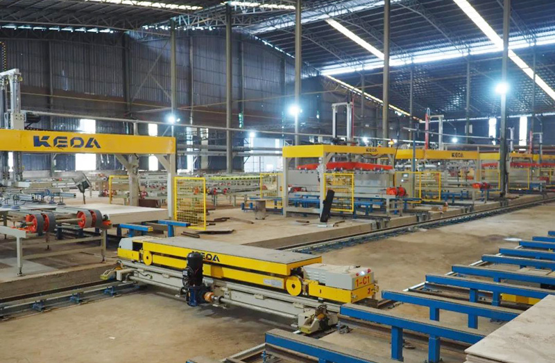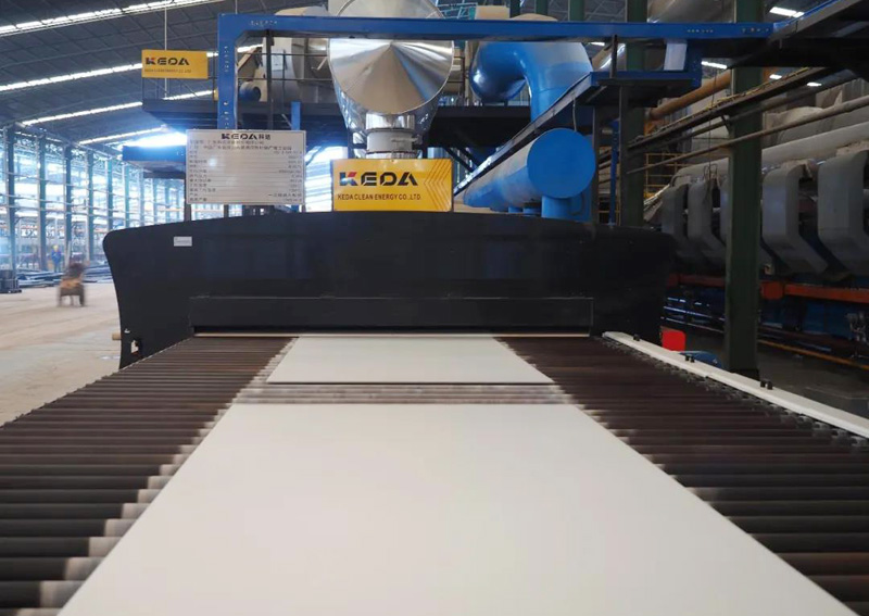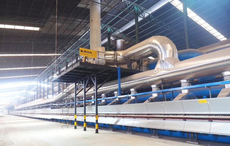 在盛世東方廠房車間,科達(dá)350米長的窯爐如一條藍(lán)色巨龍橫臥于此,這是科達(dá)全新一代工業(yè)4.0+數(shù)字智能化高端巖板窯爐,繼在廣東中盛有了首次成功應(yīng)用之后再獲成功。