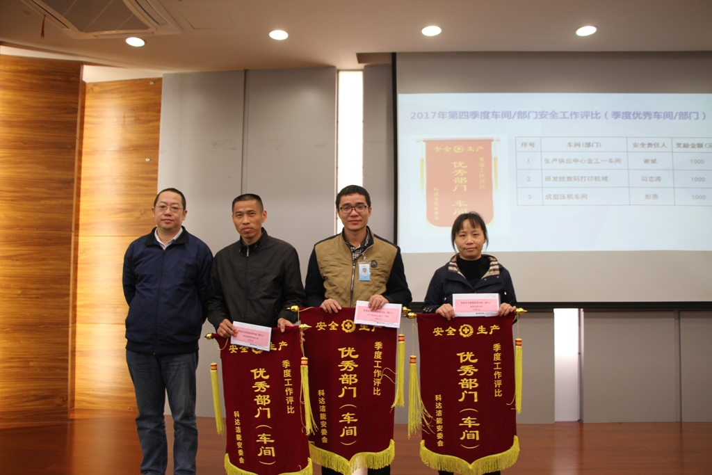 2017年第四季度安全生產(chǎn)優(yōu)秀部門(車間):生產(chǎn)供應(yīng)中心金工一車間、研發(fā)院數(shù)碼打印機械裝配車間、成型壓機車間(獎金:1000元/單位),生產(chǎn)供應(yīng)中心總經(jīng)理毛清為獲獎單位頒獎。