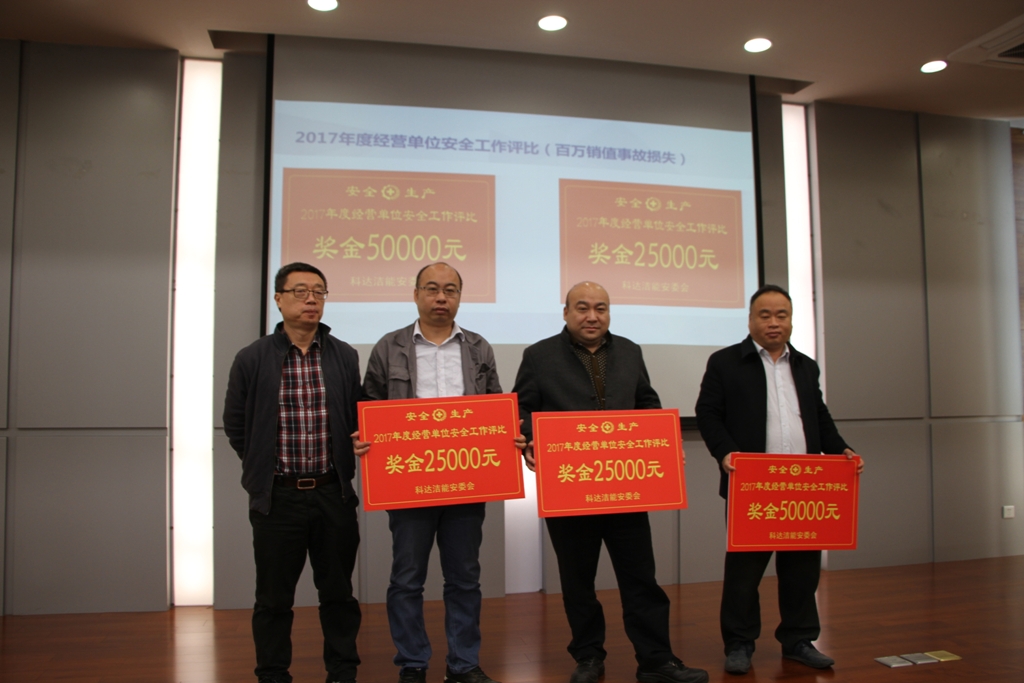 2017年度經(jīng)營單位安全評比獲獎單位:整線工程事業(yè)部(獎金50000元)、成型事業(yè)部(獎金25000元)、深加工事業(yè)部(獎金25000元),公司副總裁周鵬為獲獎單位頒獎。
