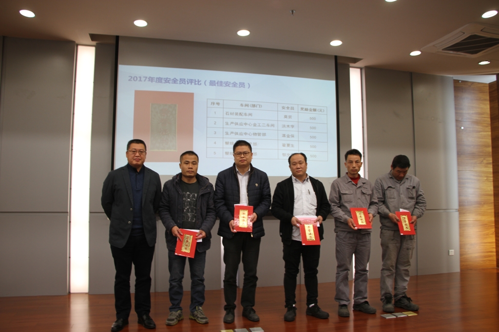 會上,公司安委會根據(jù)《公司安全工作考核激勵辦法》相關(guān)規(guī)定及2017年第四季度、2017年度安全工作考核結(jié)果,隆重表彰了在季度、年度安全工作優(yōu)秀單位和個人,生產(chǎn)供應(yīng)中心總經(jīng)理毛清、公司副總裁周鵬、陶瓷科技公司總經(jīng)理王德良、配件服務(wù)事業(yè)部總經(jīng)理隋旭東分別為獲得季度、年度安全獎勵的單位和個人代表頒發(fā)錦旗(證書)和獎金,石材公司董事長劉建軍為12.10火險救援人員代表頒發(fā)了二次表彰獎金。