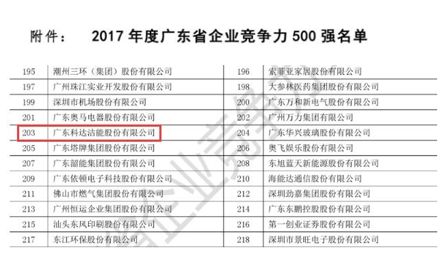 1月18日上午,由廣東省企業(yè)競爭力促進會主辦的“2017廣東省企業(yè)競爭力500強”新聞發(fā)布會在廣州海珠金逸影城舉行。廣東省企業(yè)競爭力促進會魏啟超會長、張明副會長、張宇宏秘書長,以及廣東省體制改革研究會副會長楊平教授和部分“2017廣東省企業(yè)競爭力500強”入選企業(yè)代表出席本次發(fā)布會,來自廣東省內(nèi)外的近三十家主流新聞媒體到會采訪??七_潔能以203名的成績榮登2017年“廣東省企業(yè)競爭力500強”榜單。