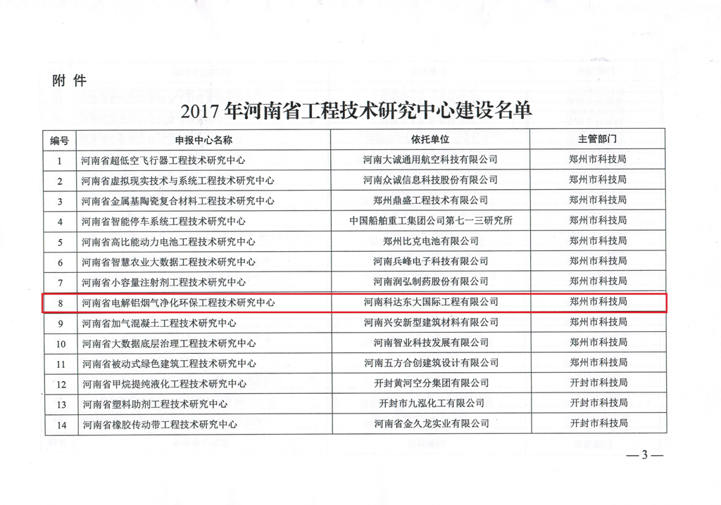 日前,河南省科技廳公布了2017年新認(rèn)定的河南省工程技術(shù)研究中心名單,科達(dá)東大申報的“河南省電解鋁煙氣凈化環(huán)保工程技術(shù)研究中心”金榜題名,成功榮獲“河南省工程技術(shù)研究中心”榮譽(yù)稱號。