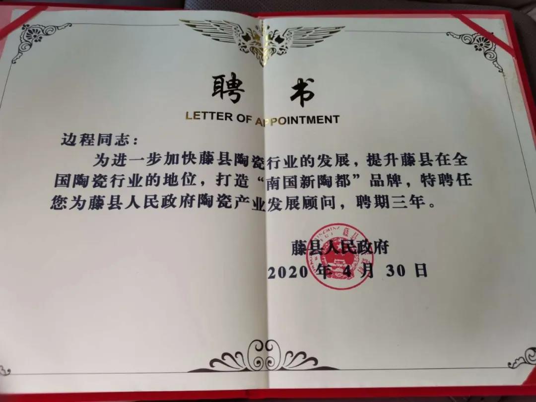 藤縣人民政府特別聘請邊董擔(dān)任“藤縣人民政府陶瓷產(chǎn)業(yè)發(fā)展顧問”,在廣西歐神諾工廠舉行了聘任儀式,藤縣縣長覃仕平向邊董頒發(fā)“聘任證書”。