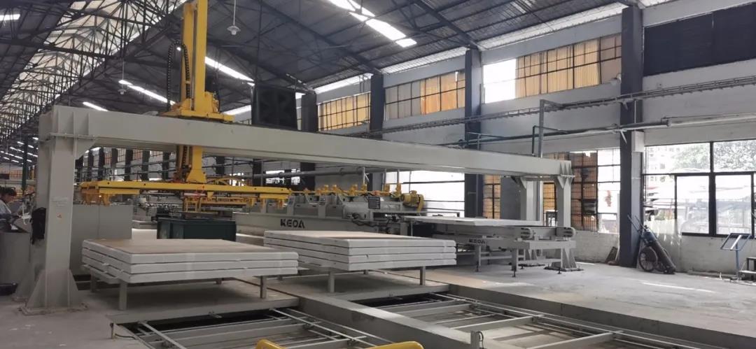 規(guī)格最大最完美。以往輥道窯做發(fā)泡陶瓷的最大規(guī)格為1200×2400(mm)或1800×2400(mm),而這條生產(chǎn)線生產(chǎn)的產(chǎn)品毛坯規(guī)格為2440×3000×100(mm),第一片出窯的毛板經(jīng)過(guò)現(xiàn)場(chǎng)實(shí)測(cè)達(dá)到了2500×3150(mm),在產(chǎn)品規(guī)格上,不論橫向還是縱向都做到了行業(yè)最大。切割后成品規(guī)格可選擇600×2440×100mm(5塊),或600×3000×100mm(4塊),從兩個(gè)方向自由分切??梢詽M足終端的不同需求,通常的標(biāo)準(zhǔn)商品房,有承重梁的房間高度為2.44米,沒(méi)有承重墻的房間高度為3米,所以這條生產(chǎn)線2440×3000(mm)的規(guī)格設(shè)定做到了業(yè)界追求的最完美尺寸,最大程度上提高了材料利用率。