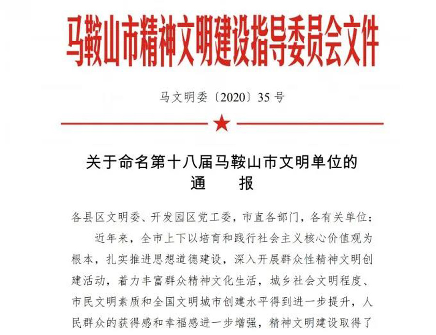 1月4日,馬鞍山市精神文明建設(shè)指導(dǎo)委員會(huì)發(fā)布《關(guān)于命名第十八屆馬鞍山市文明單位的通報(bào)》(馬文明委〔2020〕35 號(hào)),通報(bào)指出,為充分展示全市精神文明創(chuàng)建活動(dòng)成果,進(jìn)一步調(diào)動(dòng)全社會(huì)積極參與精神文明建設(shè)的主動(dòng)性,決定命名市機(jī)關(guān)事務(wù)管理中心等 365個(gè)單位為“第十八屆馬鞍山市文明單位”,并公布名單。