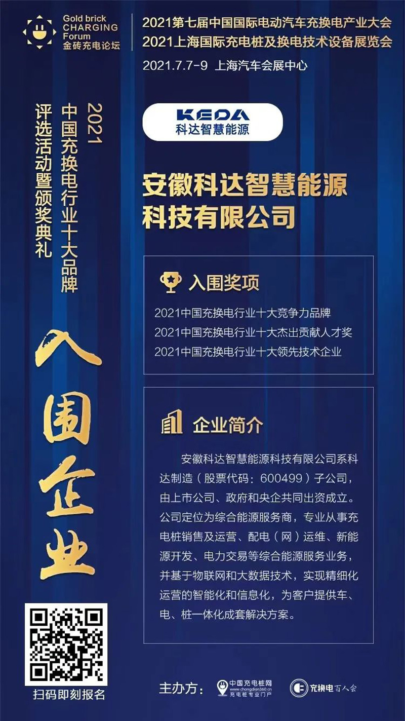 其中,安徽科達(dá)智慧能源科技有限公司入圍2021中國(guó)充換電行業(yè)十大競(jìng)爭(zhēng)力品、2021中國(guó)充換電行業(yè)十大杰出貢獻(xiàn)人才、2021中國(guó)充換電行業(yè)十大領(lǐng)先技術(shù)企業(yè)。