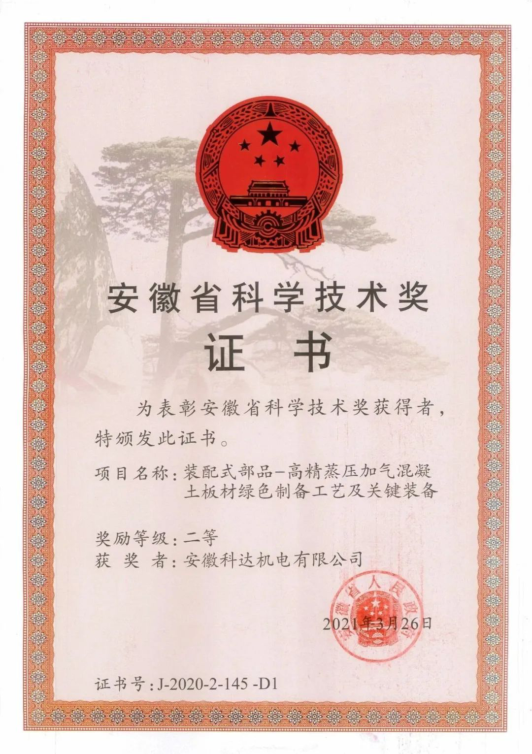 近日,安徽省科學技術獎勵暨加快建設科技創(chuàng)新攻堅力量體系推進大會在合肥召開,安徽省委常委、常務副省長、省政協副主席鄧向陽宣讀了2020年度安徽省科學技術獎勵決定,公布了2020年度科學技術獎獲獎項目及人員名單。其中,安徽科達機電有限公司主持研發(fā)的“裝配式部品-高精蒸壓加氣混凝土板材綠色制備工藝及關鍵裝備”獲安徽省科技進步二等獎,安徽科達潔能股份有限公司的“KDJN旋流撞擊式干粉氣化技術”獲省級科技進步三等獎。
