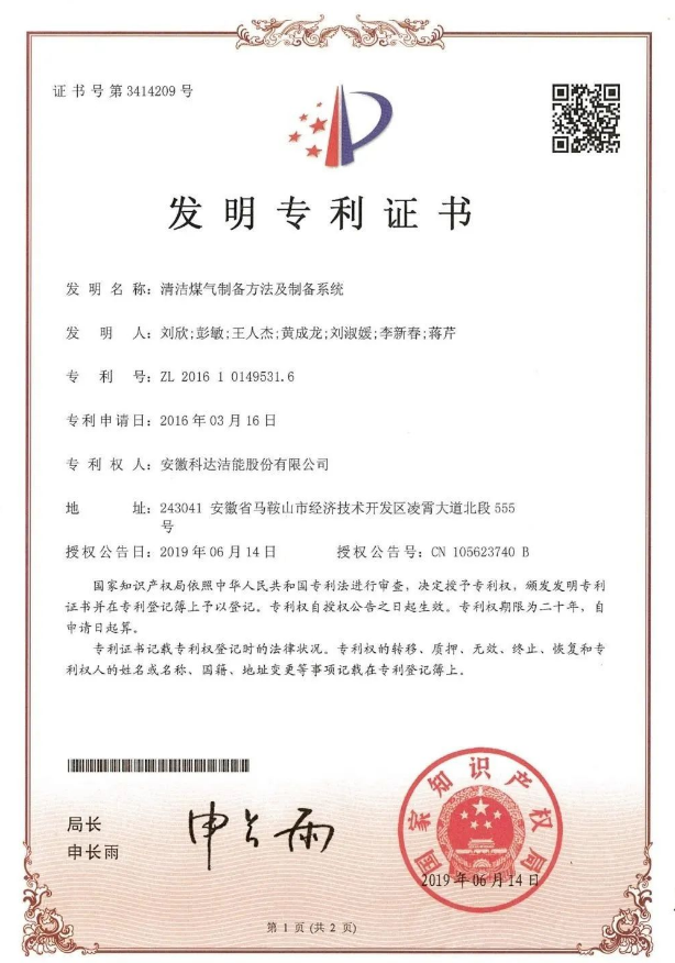 由國家知識產(chǎn)權(quán)局主辦的的第二十二屆中國專利獎評選已于近日公示結(jié)束,安徽科達潔能股份有限公司發(fā)明專利《清潔煤氣制備方法與制備系統(tǒng)》(專利號:ZL201610149531.6,發(fā)明人:劉欣、彭敏、王人杰、黃成龍、劉淑媛、李新春、蔣芹)榮獲中國專利優(yōu)秀獎。