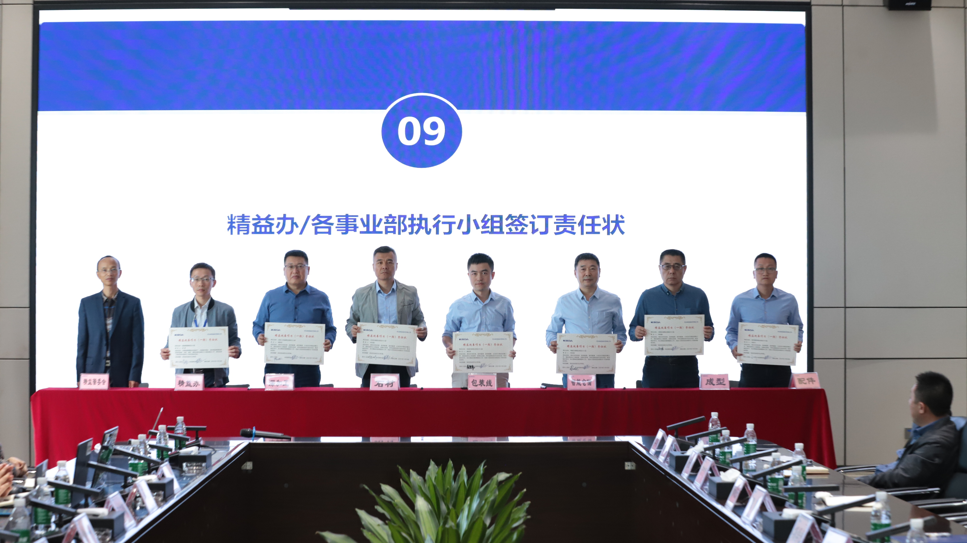 楊總隨后向中普咨詢項目總監(jiān)余一頒發(fā)精益項目授權書,并與精益辦、各事業(yè)部執(zhí)行小組負責人簽訂了責任狀。會議最后,全體參會人員在科達陶機精益辦主任李楊的帶領下進行項目實施宣誓,并在項目實施決心書上鄭重簽上了自己的名字。
