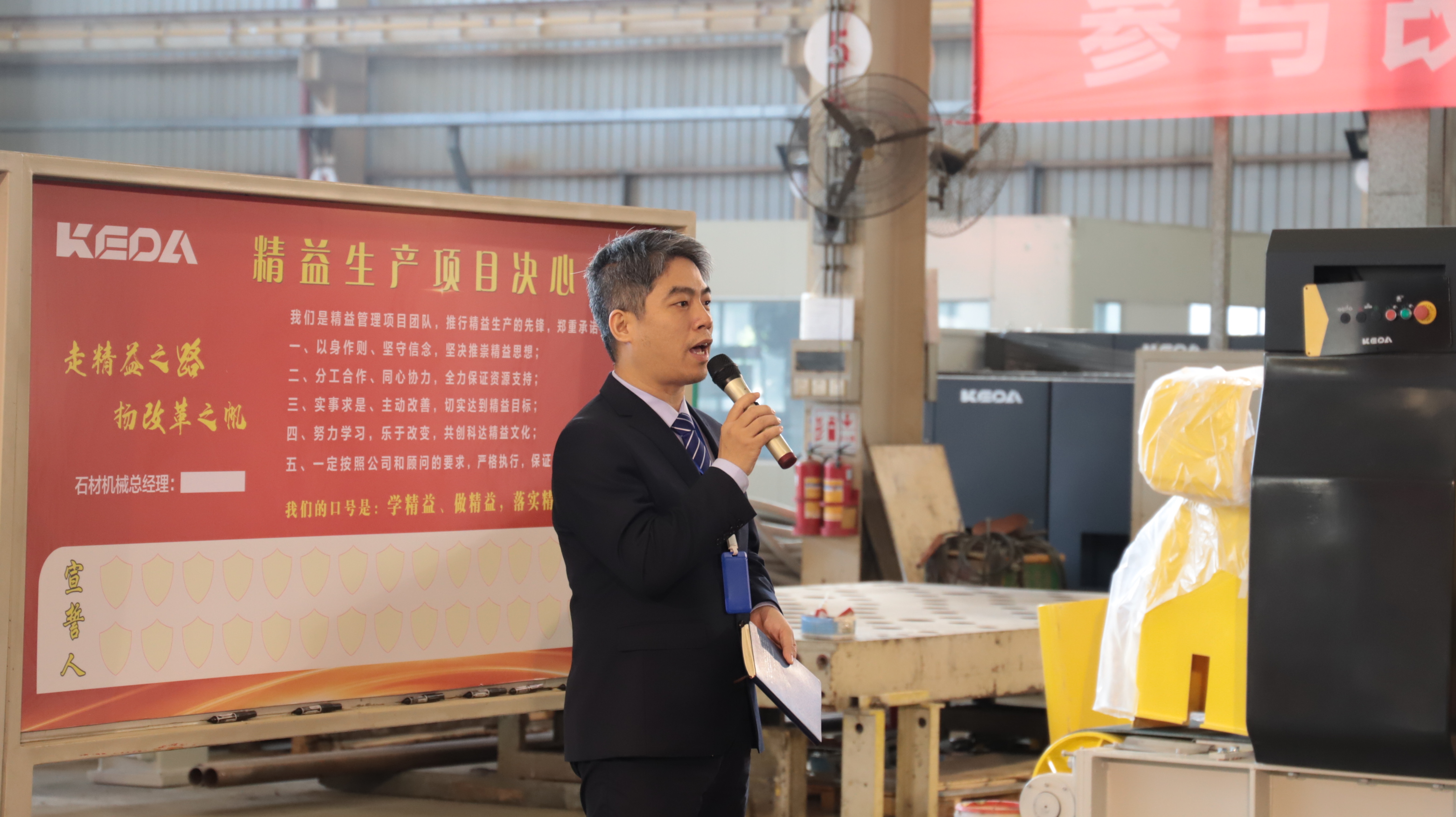 早上八點半不到,石材機械公司啟動大會在剛剛“醒來”的14號車間舉行。總經(jīng)理宋志剛結(jié)合公司、部門的內(nèi)外情況,向全體成員說明精益改革的必要性和迫切性。他指出,在精益改革的大潮中,每位員工都要統(tǒng)一認識,下定決心去執(zhí)行。改革不是改變表象,而是改變每個人的思想。精益改革也不是短期的、運動式的,而是長期、持續(xù)性的。做精益不是“完成任務(wù)”,而是減少浪費,創(chuàng)造最大價值。只要企業(yè)在生產(chǎn),精益就要一直進行。