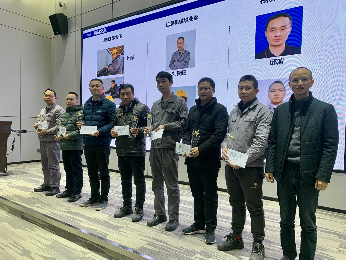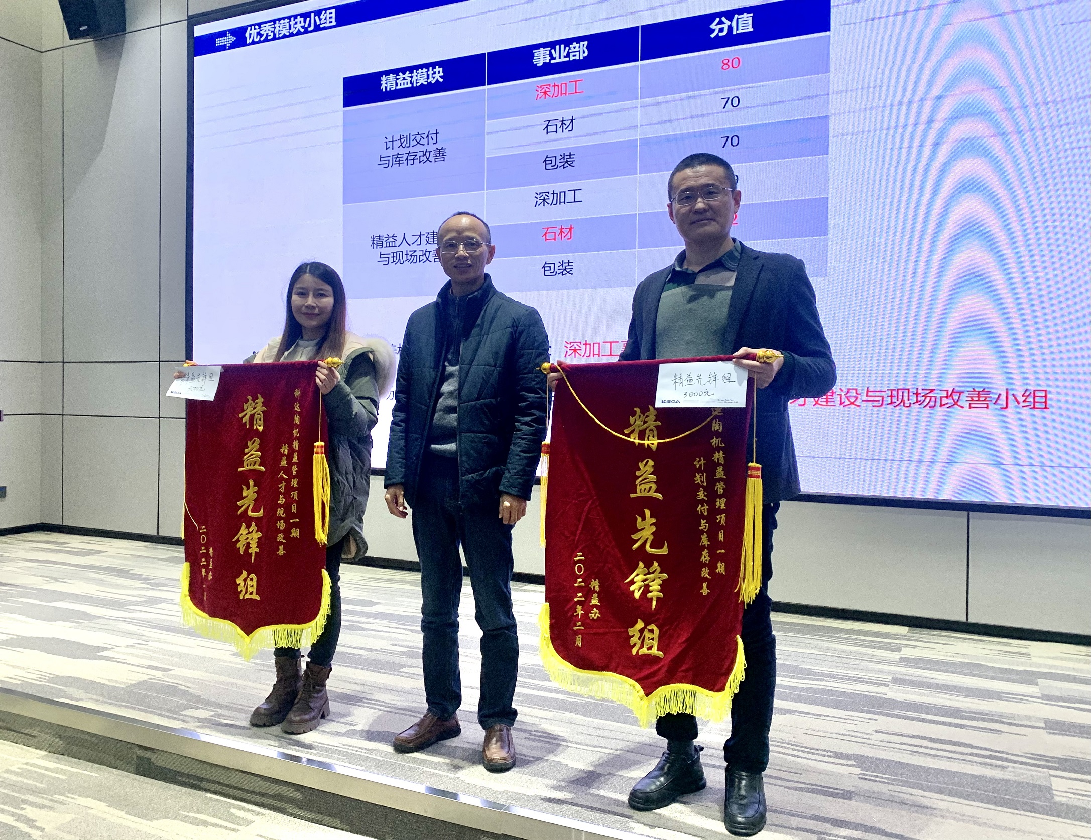 公司董事、總經(jīng)理楊學先為“精益先鋒組”與“精益之星”頒獎。石材精益人才建設與現(xiàn)場改善模塊、深加工計劃交付與庫存改善模塊榮獲“精益先鋒組”榮譽稱號。孫崗、陳國、華佗、劉復超、張波、邱濤、邵棟才7位同事獲得“精益之星”榮譽稱號。