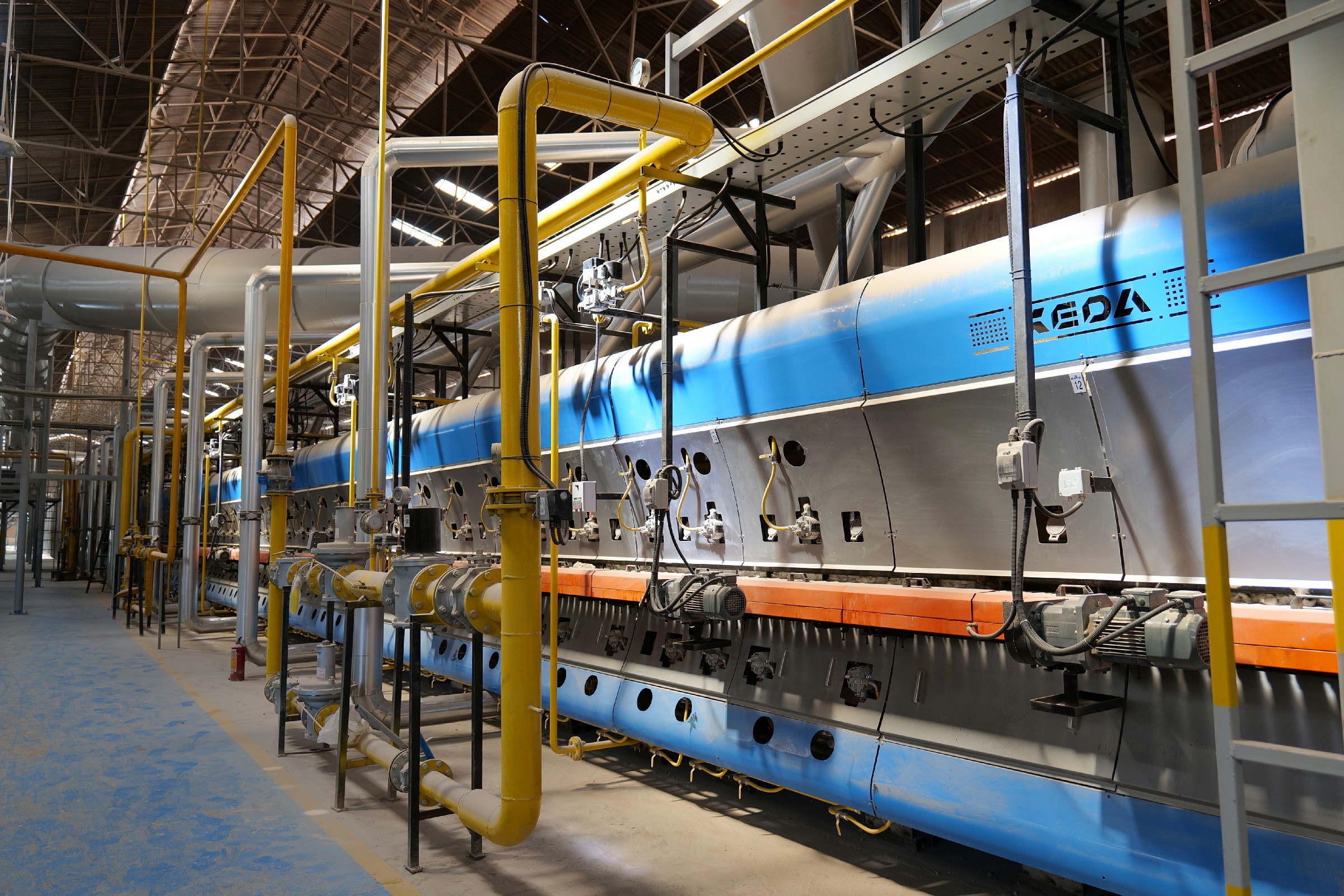 針對厚磚燒成難干燥、難氧化、冷卻慢、負(fù)荷重、傳動慢的難題,科達(dá)采取了多層干燥、提前氧化、采用加強(qiáng)傳動等多項創(chuàng)新舉措,保證了產(chǎn)品品質(zhì);同時,通過讓燃料充分燃燒,助燃風(fēng)加熱技術(shù)、自動升降溫技術(shù)、對外排廢氣帶走熱量的回收利用等技術(shù)節(jié)約了氣耗,在接近雙零吸水率基礎(chǔ)上實(shí)現(xiàn)了全線2.3Nm3/㎡天然氣的能耗效果,風(fēng)機(jī)、風(fēng)管路節(jié)能系統(tǒng)的應(yīng)用更大大降低了電耗。