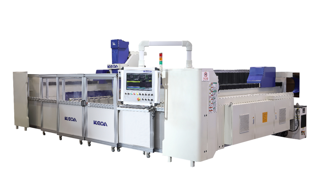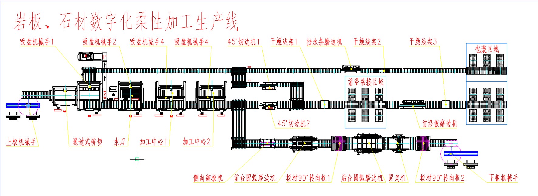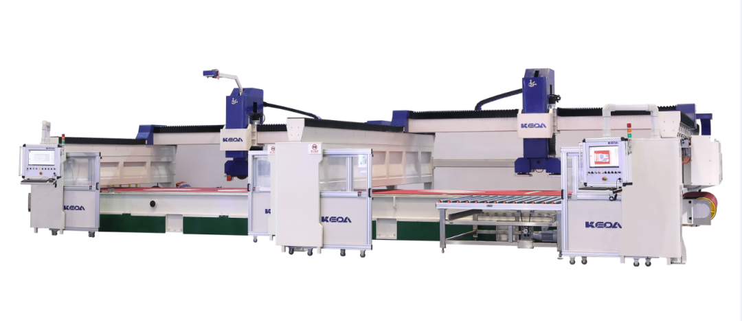 除了核心的橋切加工設(shè)備,包括科達(dá)智能加工中心、AC五軸水刀、雙邊數(shù)控磨邊成型機(jī)、數(shù)控圓角機(jī)以及數(shù)控45度磨邊開槽機(jī)這些設(shè)備組合在一起,科達(dá)為行業(yè)提供貼標(biāo)識別、開孔開料、余料廢料收集、內(nèi)孔成型拋光、外研成型拋光等全自動無人化柔性生產(chǎn)解決方案,可滿足巖板、石材的各種深加工需求。