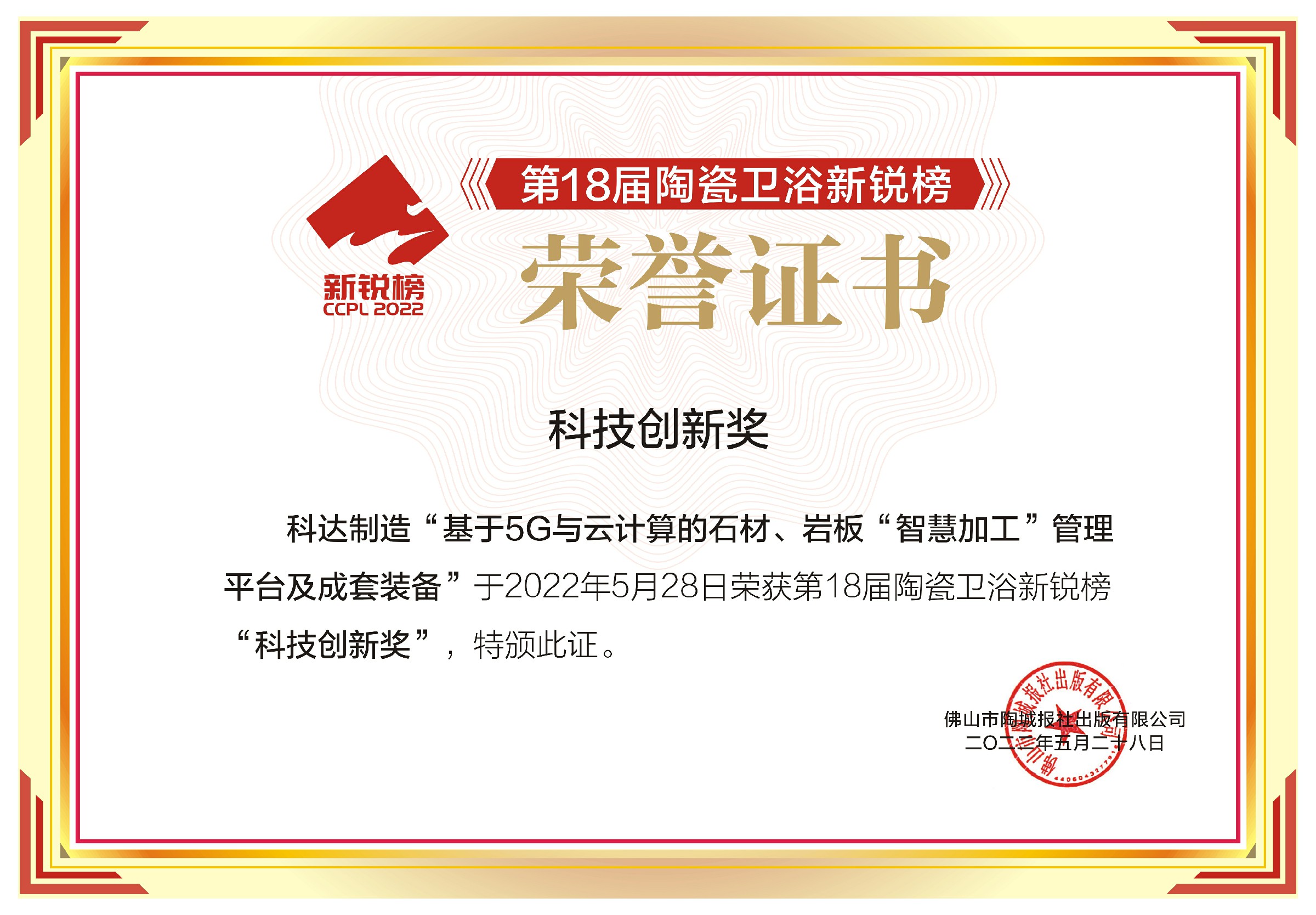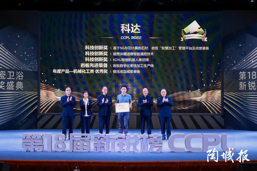 在與巖板相關(guān)的獎(jiǎng)項(xiàng)里,科達(dá)輥壓成型成套裝備榮獲“年度產(chǎn)品——機(jī)械化工類優(yōu)秀獎(jiǎng)”;科達(dá)巖板數(shù)字化柔性加工生產(chǎn)線榮獲“巖板先進(jìn)裝備”;基于5G與云計(jì)算的石材、巖板“智慧加工”管理平臺(tái)及成套裝備榮獲“科技創(chuàng)新獎(jiǎng)”。
