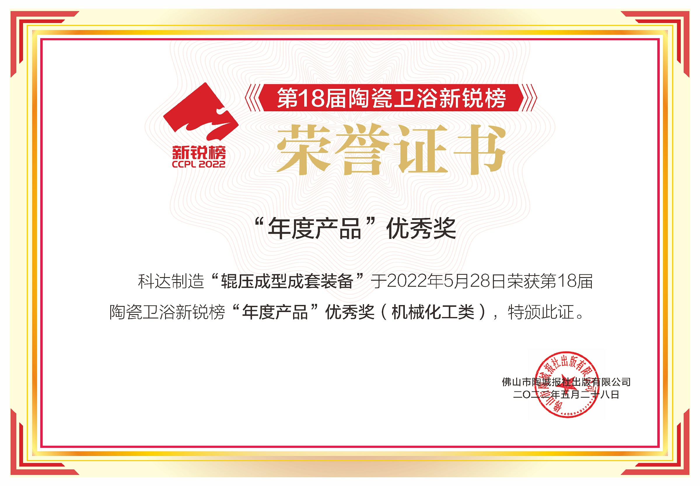 科達(dá)及力泰品牌憑借強(qiáng)大創(chuàng)新實(shí)力,一舉斬獲新銳榜多項(xiàng)大獎(jiǎng)。其中,科達(dá)榮獲“巖板先進(jìn)裝備”(巖板數(shù)字化柔性加工生產(chǎn)線)、“年度產(chǎn)品優(yōu)秀獎(jiǎng)(輥壓成型成套裝備)以及”三項(xiàng)“科技創(chuàng)新獎(jiǎng)(超寬體輥道窯智能溫控技術(shù)、基于5G與云計(jì)算的石材、巖板“智慧加工”管理平臺(tái)及成套裝備、KDXJ智能機(jī)器人修坯線)”共五項(xiàng)大獎(jiǎng)。恒力泰LT6800自動(dòng)液壓機(jī)榮獲“年度產(chǎn)品金獎(jiǎng)”、德力泰Carboneutral高效節(jié)能型雙層巖板窯榮獲“年度產(chǎn)品金獎(jiǎng)”和“巖板先進(jìn)裝備獎(jiǎng)”。