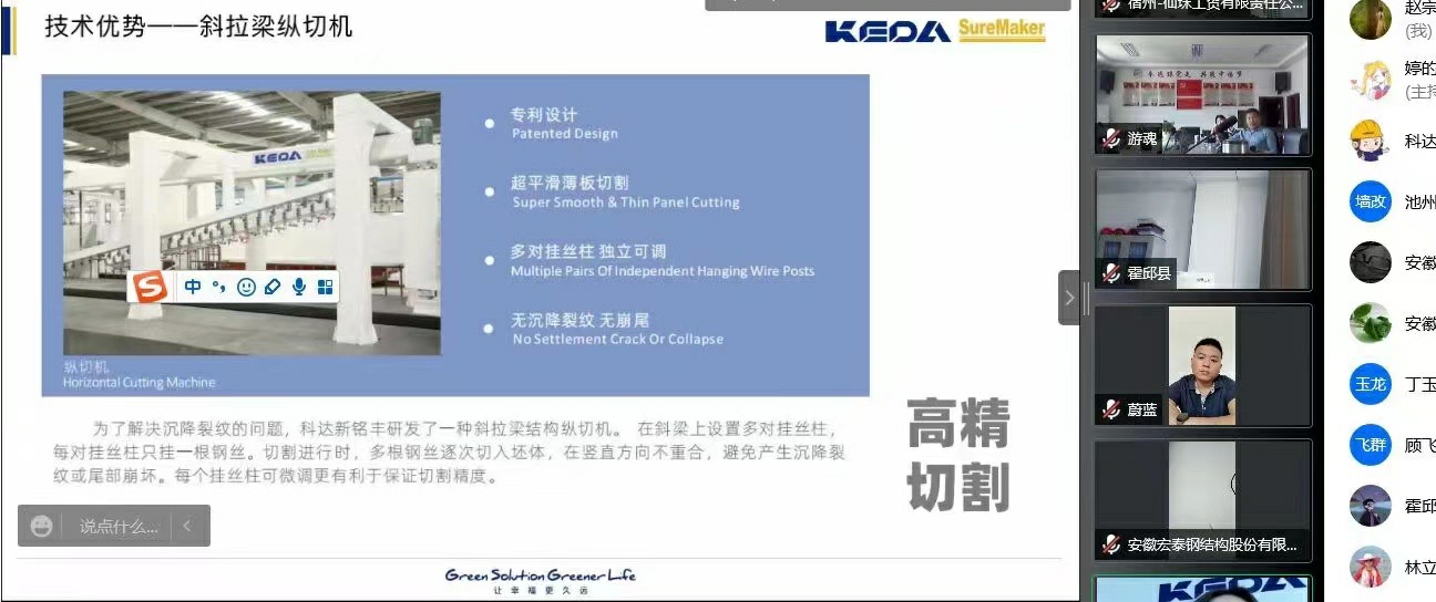 在本次線上會議上,安徽科達(dá)機電股份有限公司系統(tǒng)地向參會者們介紹了蒸壓加氣混凝土產(chǎn)品、政策支持與發(fā)展、安徽科達(dá)機電企業(yè)介紹及整線系統(tǒng)解決方案中的技術(shù)優(yōu)勢與服務(wù),其中突出展示了新一代設(shè)備及工藝升級的優(yōu)勢。安徽科達(dá)機電對于蒸壓加氣混凝土整線系統(tǒng)的深刻理解和強大優(yōu)勢吸引了大批墻材生產(chǎn)企業(yè)代表前來參會,現(xiàn)場有許多企業(yè)直接致電安徽科達(dá)機電咨詢業(yè)務(wù),表達(dá)合作意向。