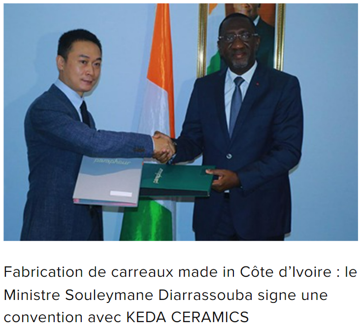 5月25日,科特迪瓦貿(mào)易、工業(yè)和中小企業(yè)促進(jìn)部部長(zhǎng)Souleymane Diarrassouba先生與科達(dá)科特迪瓦陶瓷有限公司代表鄧勇先生在西非科特迪瓦首都阿比讓簽訂了一項(xiàng)重要的合作協(xié)議,該協(xié)議旨在將公司科特迪瓦陶瓷項(xiàng)目列入科特迪瓦國(guó)家2021-2025年7個(gè)重點(diǎn)發(fā)展產(chǎn)業(yè)集群項(xiàng)目,并承諾由貿(mào)工部牽頭,從政策層面保證項(xiàng)目按照計(jì)劃投產(chǎn)。該簽約儀式得到了科特迪瓦當(dāng)?shù)仉娨暸_(tái)的采訪報(bào)道。自此,公司科特迪瓦陶瓷項(xiàng)目正式進(jìn)入動(dòng)工建設(shè)階段。