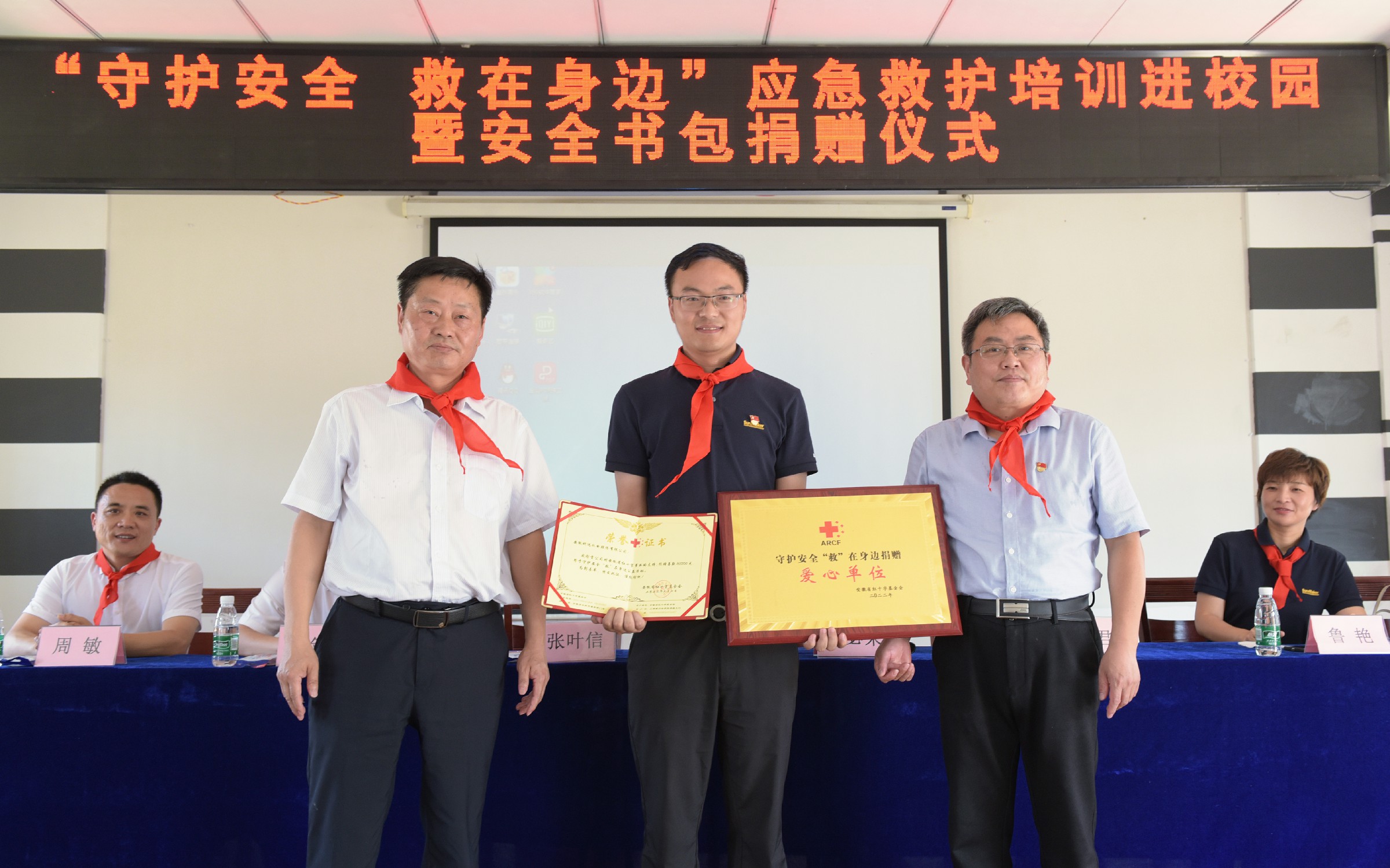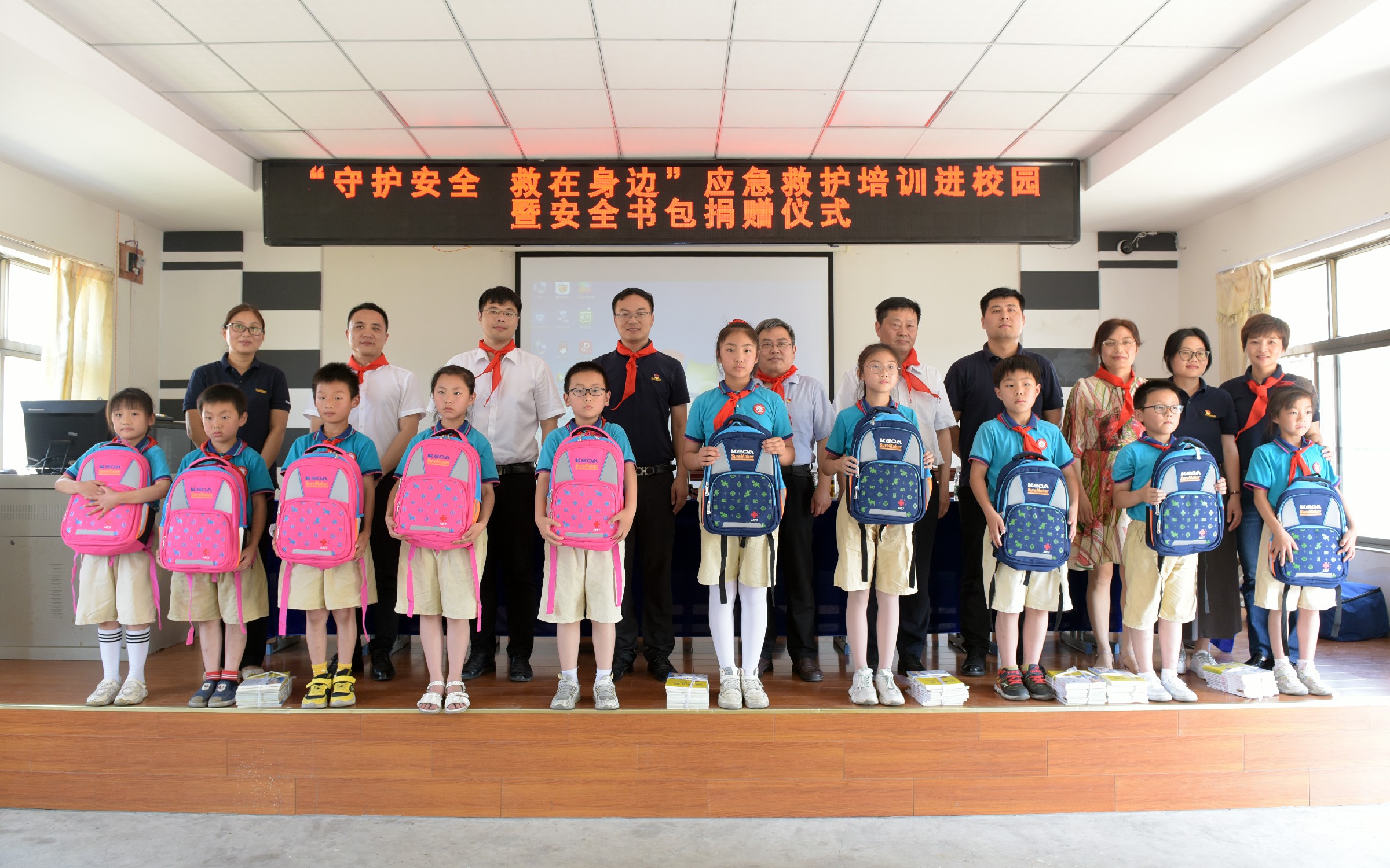6月15日下午,“守護(hù)安全,救在身邊”應(yīng)急救護(hù)培訓(xùn)公益活動暨安徽科達(dá)機(jī)電股份有限公司安全防護(hù)書包捐贈儀式在馬鞍山市和縣功橋鎮(zhèn)中心小學(xué)舉行。馬鞍山市紅十字會常務(wù)副會長方必來,和縣副縣長張朝君,功橋鎮(zhèn)鎮(zhèn)長張劍嘯,安徽科達(dá)機(jī)電總經(jīng)理助理、黨支部書記張葉信及行政人力總監(jiān)魯艷共同出席了捐贈儀式。