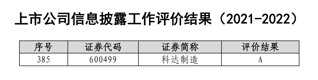 科達(dá)制造喜獲上交所信息披露A級評價(jià)