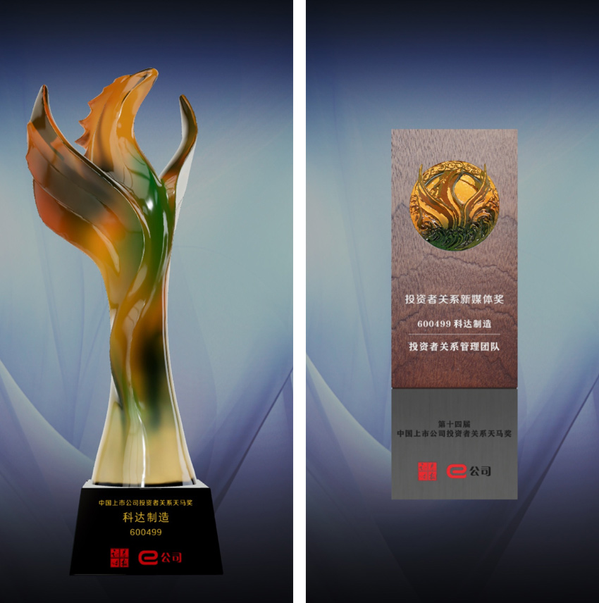 科達(dá)制造憑借在投資者關(guān)系工作中的優(yōu)異表現(xiàn)在評(píng)選中脫穎而出,榮獲“中國上市公司投資者關(guān)系天馬獎(jiǎng)”、“中國上市公司投資者關(guān)系新媒體獎(jiǎng)”兩項(xiàng)大獎(jiǎng),公司副總裁、董事會(huì)秘書李躍進(jìn)先生榮獲“中國上市公司投資者關(guān)系杰出董秘獎(jiǎng)”。