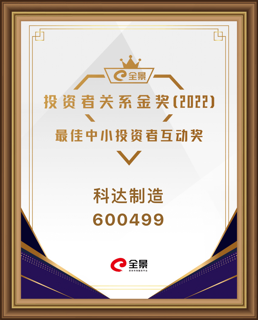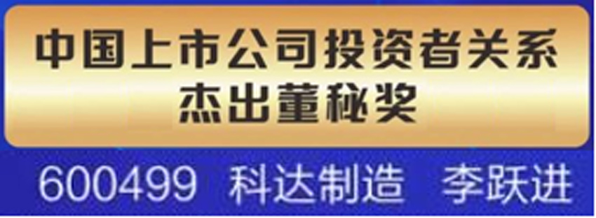 近期,科達(dá)制造榮獲全景投資者關(guān)系金獎(jiǎng)(2022)之“最佳中小投資者互動(dòng)獎(jiǎng)”,并獲得證券時(shí)報(bào)第十四屆“天馬獎(jiǎng)”之“中國上市公司投資者關(guān)系天馬獎(jiǎng)”及“投資者關(guān)系新媒體獎(jiǎng)”,同時(shí),公司副總裁、董事會(huì)秘書李躍進(jìn)先生榮獲證券時(shí)報(bào)第十四屆“天馬獎(jiǎng)”之“中國上市公司投資者關(guān)系杰出董秘獎(jiǎng)”。