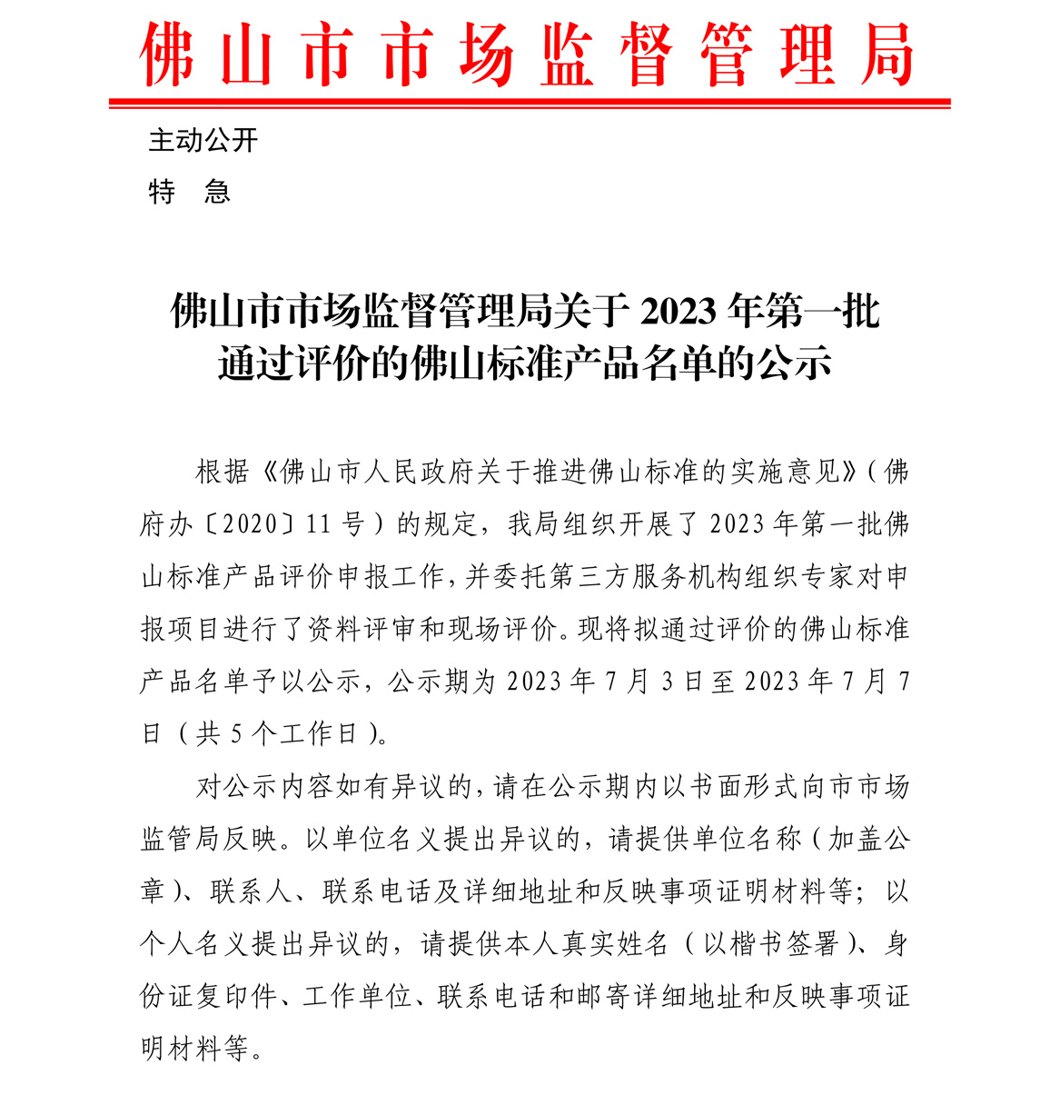 據(jù)悉,為深入貫徹落實(shí)佛山市委、市政府關(guān)于推動(dòng)高質(zhì)量發(fā)展、制造業(yè)當(dāng)家的工作部署,以高標(biāo)準(zhǔn)打造中國制造品質(zhì)標(biāo)桿,提升佛山制造知名度和影響力,根據(jù)《佛山市人民政府關(guān)于推進(jìn)佛山標(biāo)準(zhǔn)工作的實(shí)施意見》要求,佛山市市場監(jiān)督管理局積極推動(dòng)“佛山標(biāo)準(zhǔn)產(chǎn)品”的認(rèn)定工作。