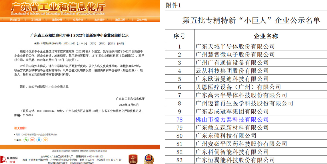 ▲德力泰榮獲廣東省“專精特新中小企業(yè)“稱號