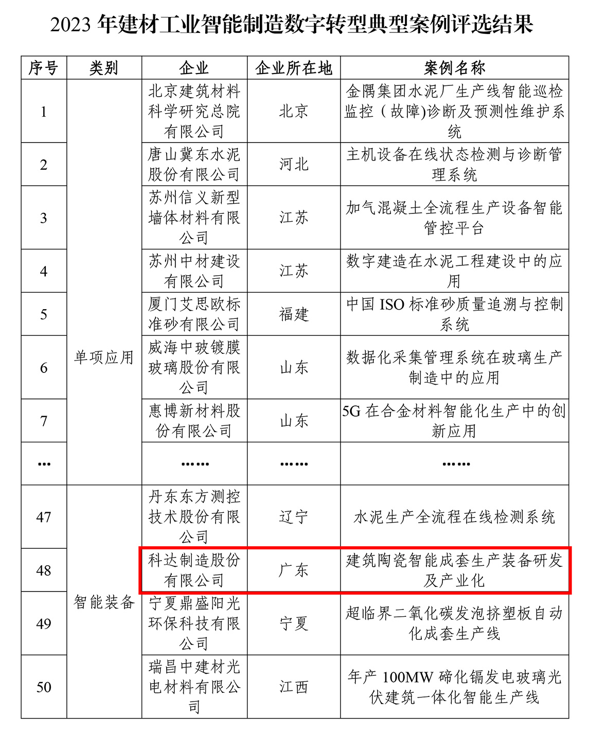 近日,經(jīng)地方工業(yè)和信息化主管部門(mén)及中央企業(yè)推薦、專家評(píng)審,工信部原材料司發(fā)布了2023年50個(gè)建材工業(yè)智能制造數(shù)字轉(zhuǎn)型典型案例,涵蓋單項(xiàng)應(yīng)用、工業(yè)互聯(lián)網(wǎng)場(chǎng)景、數(shù)字礦山、系統(tǒng)解決方案、智能工廠、智能裝備、智能制造創(chuàng)新平臺(tái)等7個(gè)方向??七_(dá)制造的“建筑陶瓷智能成套生產(chǎn)裝備研發(fā)及產(chǎn)業(yè)化”案例入選“智能裝備”類別。