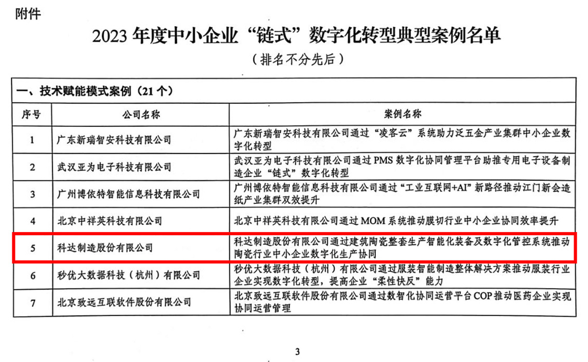 此外,根據(jù)工信部中小企業(yè)局發(fā)布的《關(guān)于征集2023年度中小企業(yè)“鏈?zhǔn)健睌?shù)字化轉(zhuǎn)型典型案例的通知》(工企業(yè)函〔2023〕81號(hào)),中國(guó)工業(yè)互聯(lián)網(wǎng)研究院、國(guó)家工業(yè)信息安全發(fā)展研究中心通過(guò)組織專家評(píng)審,擇優(yōu)遴選出66個(gè)典型案例。科達(dá)制造的“通過(guò)建筑陶瓷整套生產(chǎn)智能化裝備及數(shù)字化管控系統(tǒng)推動(dòng)陶瓷行業(yè)中小企業(yè)數(shù)字化生產(chǎn)協(xié)同”案例入選“技術(shù)賦能”類別。