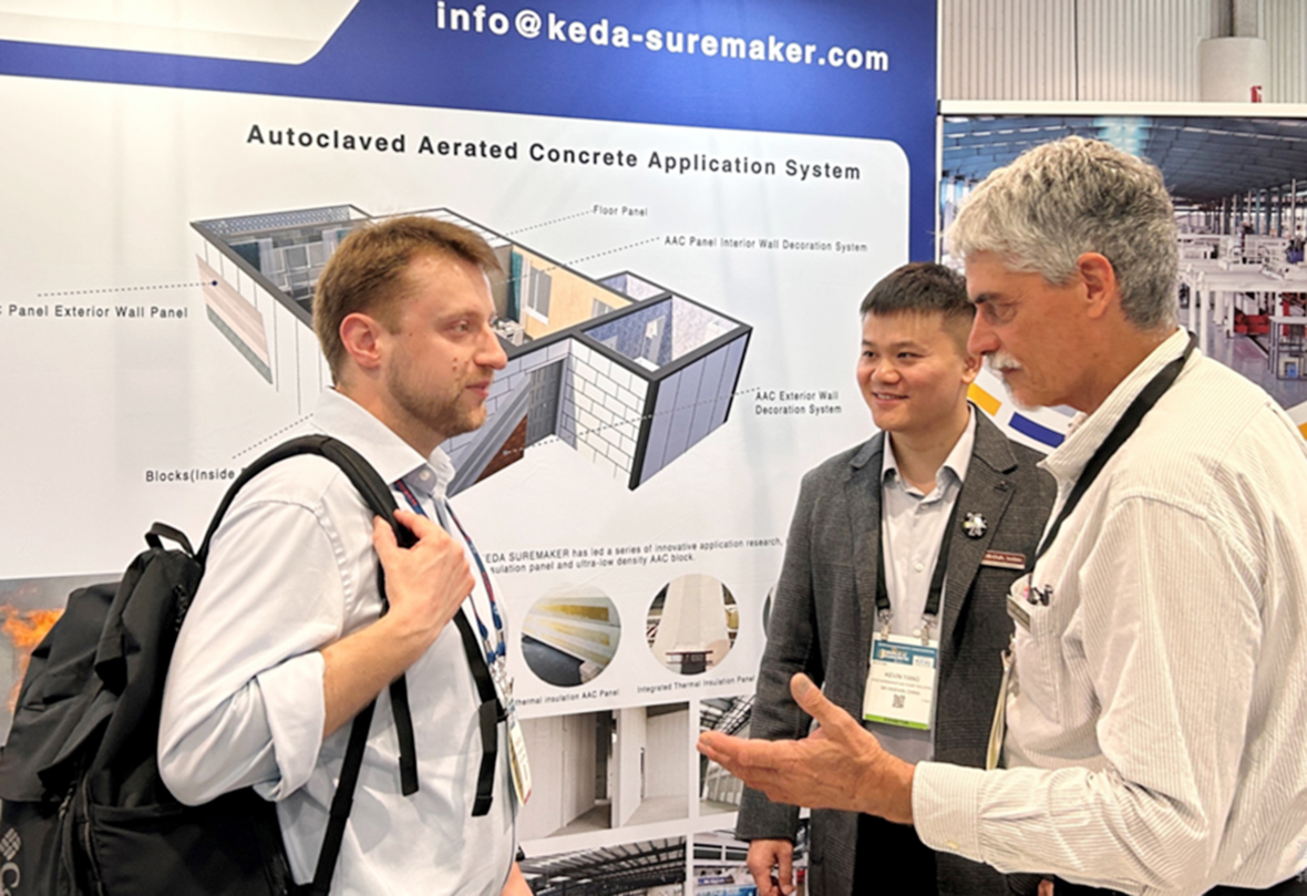 本屆展會(huì)上,安徽科達(dá)機(jī)電不僅為買家?guī)砹藲v經(jīng)全球數(shù)以百計(jì)成功項(xiàng)目檢驗(yàn)的AAC整線裝備,同時(shí)還將可持續(xù)、數(shù)字化創(chuàng)新融入其中,可為AAC生產(chǎn)廠家提供節(jié)能減排、碳排放管理方案、生產(chǎn)數(shù)據(jù)追溯等服務(wù),以綠色、低碳的理念為廣大AAC生產(chǎn)廠商的可持續(xù)發(fā)展保駕護(hù)航。安徽科達(dá)機(jī)電獨(dú)特的產(chǎn)品技術(shù)、產(chǎn)品價(jià)值吸引了眾多的參展觀眾。展會(huì)開幕首日,來自全球的客戶絡(luò)繹不絕地來到展臺(tái)參觀洽談。安徽科達(dá)機(jī)電總經(jīng)理陳新疆表示,“ 安徽科達(dá)機(jī)電可為全球客戶提供從原料檢測、規(guī)劃設(shè)計(jì),到設(shè)備制造與研發(fā)、工程服務(wù)與運(yùn)營指導(dǎo)的全方位、全生命周期服務(wù)。為客戶打造高效、環(huán)保、智能的蒸壓加氣混凝土綠色工廠?!?br />