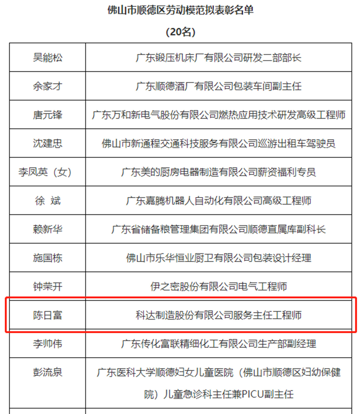 近日,科達陶機服務(wù)主任工程師陳日富獲推薦為“順德區(qū)勞動模范”,已通過公示。