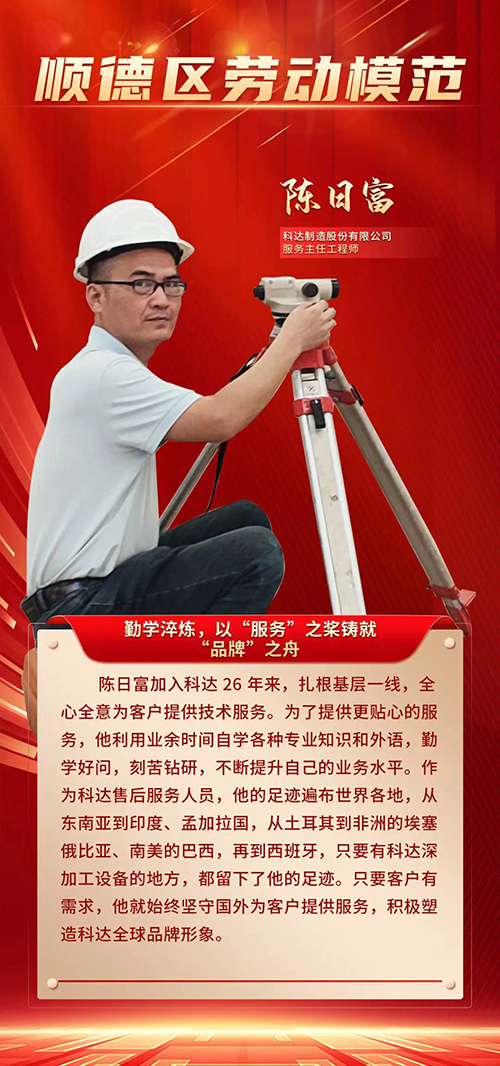 陳日富加入科達 26 年來,扎根基層一線,全心全意為客戶提供技術服務。為了提供更貼心的服務,他利用業(yè)余時間自學各種專業(yè)知識和外語,勤學好問,刻苦鉆研,不斷提升自己的業(yè)務水平。作為科達售后服務人員,他的足跡遍布世界各地,從東南亞到印度、孟加拉國,從土耳其到非洲的埃塞俄比亞、南美的巴西,再到西班牙,只要有科達深加工設備的地方,都留下了他的足跡。只要客戶有需求,他就始終堅守國外為客戶提供服務,積極塑造科達全球品牌形象。
