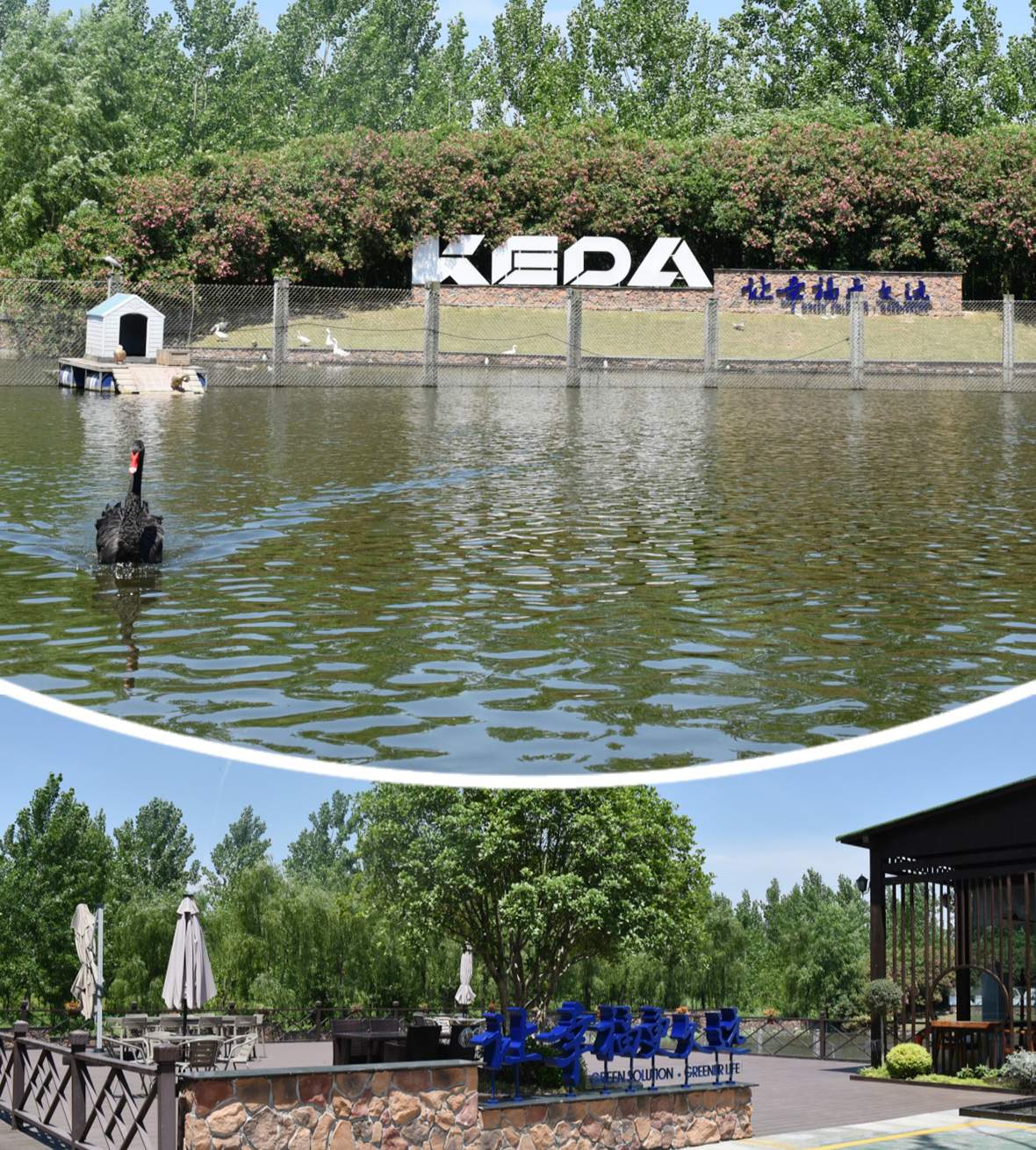 ▲經(jīng)過改造,原來雜草叢生的湖邊蛻變?yōu)轱L(fēng)景優(yōu)美的商務(wù)中心親水平臺(安徽基地)