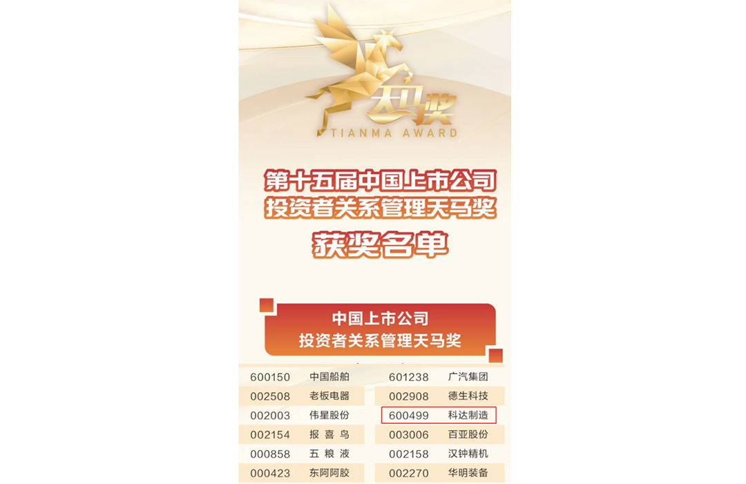 “天馬獎(jiǎng)”是國(guó)內(nèi)主流媒體較早聚焦于資本市場(chǎng)投資者關(guān)系管理領(lǐng)域的評(píng)選活動(dòng),自首次創(chuàng)辦以來(lái),至今已成功舉辦15屆,致力于促進(jìn)上市公司提高投資者服務(wù)意識(shí),推動(dòng)上市公司提升投資者關(guān)系管理水平,傳播上市公司內(nèi)在價(jià)值,是中國(guó)資本市場(chǎng)具有廣泛影響力的品牌活動(dòng)之一??七_(dá)制造憑借在投資者關(guān)系工作中的優(yōu)異表現(xiàn)在評(píng)選中脫穎而出,再度榮獲“中國(guó)上市公司投資者關(guān)系天馬獎(jiǎng)”。