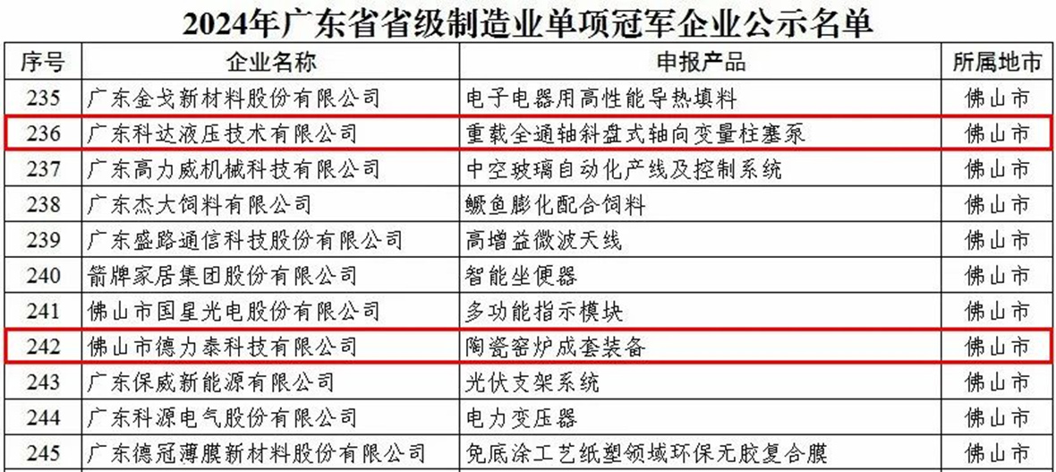 近日,廣東省工業(yè)和信息化廳公示2024年省級制造業(yè)單項冠軍企業(yè)通過名單,本次全省共有357家企業(yè)通過遴選認(rèn)定。科達制造子公司德力泰及科達液壓通過遴選榮登榜單。