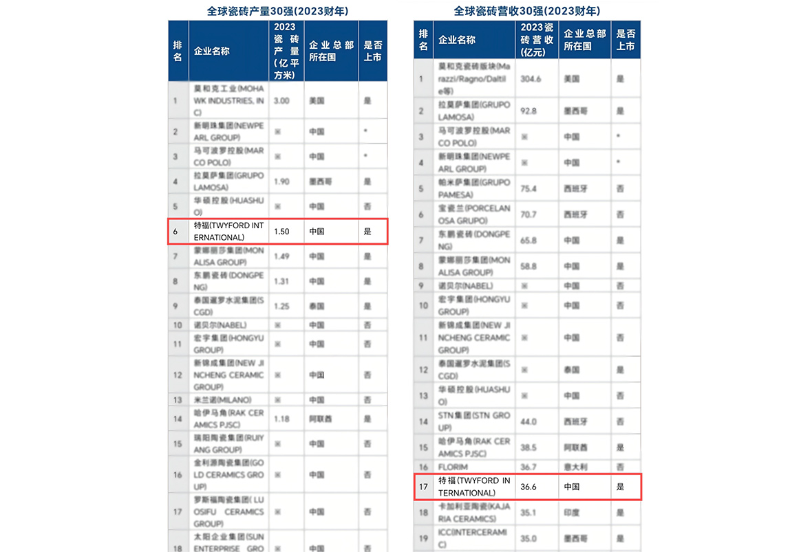 產(chǎn)量第6,營收17!特福國際躋身2023年度“全球瓷磚產(chǎn)量、營收30強(qiáng)”榜單