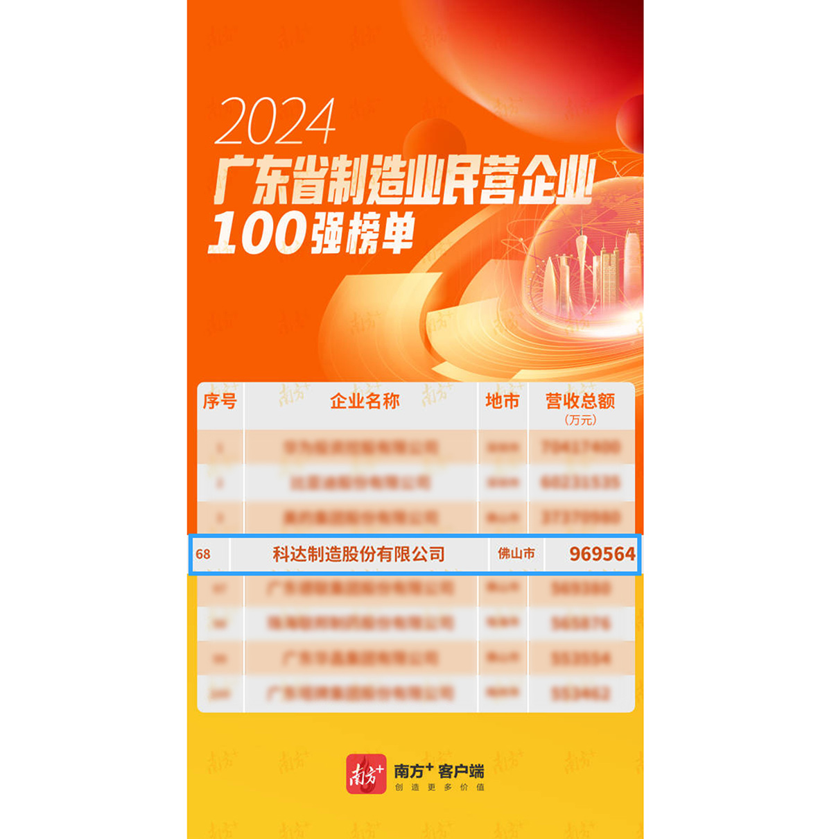 科達(dá)制造憑借卓越的綜合實(shí)力成功入圍“2024廣東省制造業(yè)民營(yíng)企業(yè)100強(qiáng)”榜單,位列第68名,且排名較去年躍升25位。