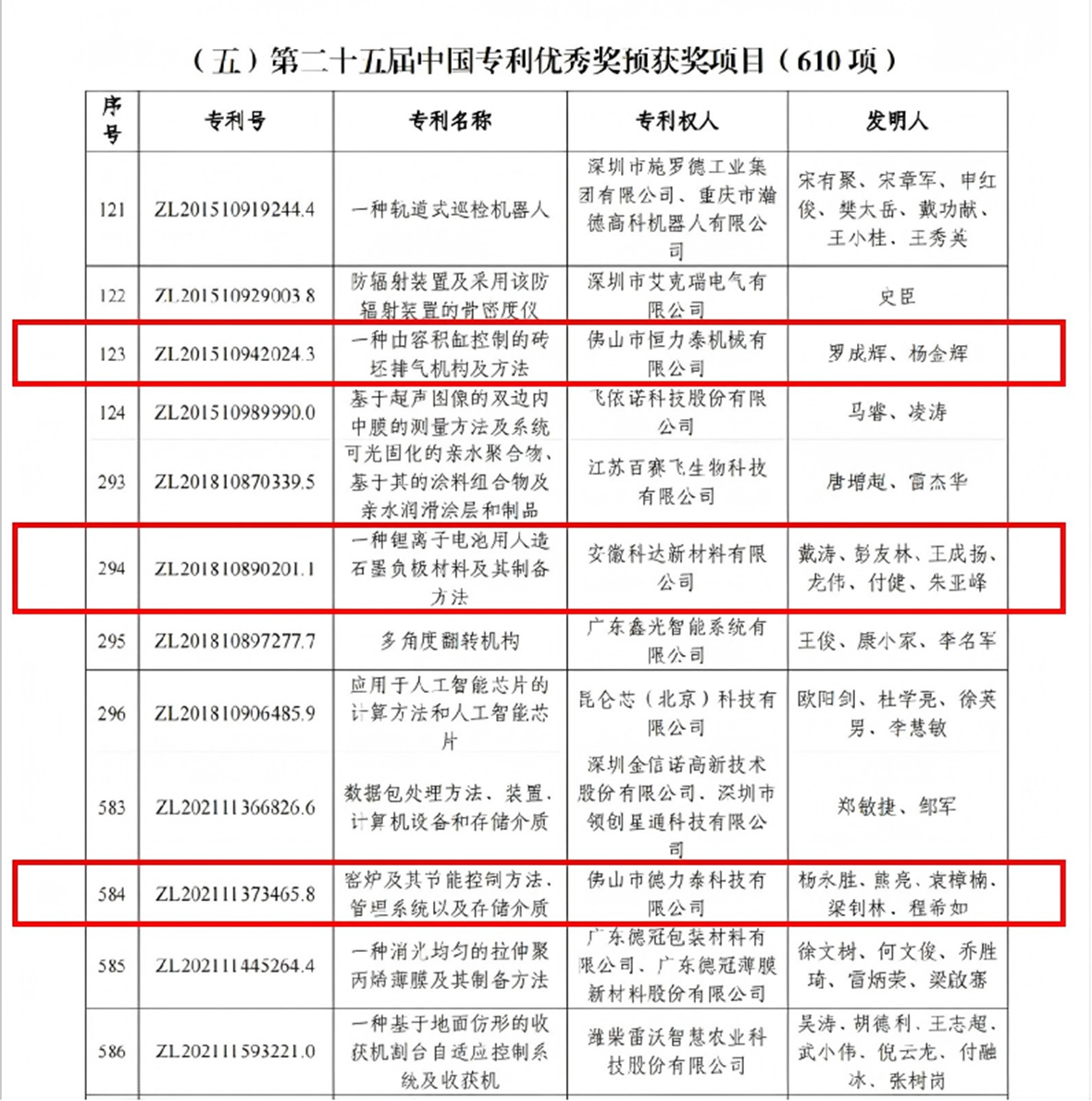 其中,子公司恒力泰“一種由容積缸控制的磚坯排氣機構及方法”項目、安徽科達新材料“一種鋰離子電池用人造石墨負極材料及其制備方法”項目、德力泰“窯爐及其節(jié)能控制方法、管理系統(tǒng)以及存儲介質”項目分獲中國專利優(yōu)秀獎。