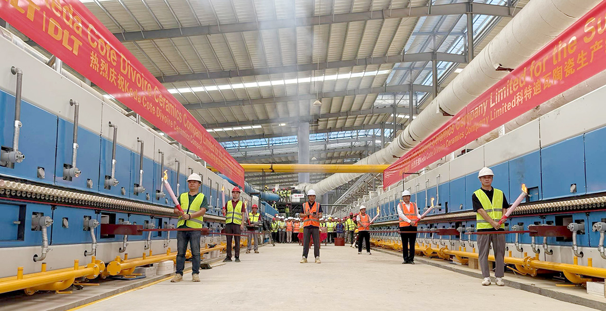 “3、2、1……點(diǎn)火!”6月25日9時(shí)58分,特福國(guó)際科特迪瓦陶瓷廠(下稱“特??铺铡保﹥?nèi),隨著特??铺枕?xiàng)目負(fù)責(zé)人鄧勇、廠長(zhǎng)朱全鋒等管理人員成功點(diǎn)燃窯爐,這條被寄予厚望的生產(chǎn)線正式宣告投產(chǎn)。